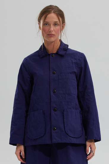 Long sleeve chore jacket featuring a raw edge pleated appliqué on the collar and raw edge rounded patch pockets. Fully lined. Cut in a custom dyed high density heavy weight Japanese cotton cloth.