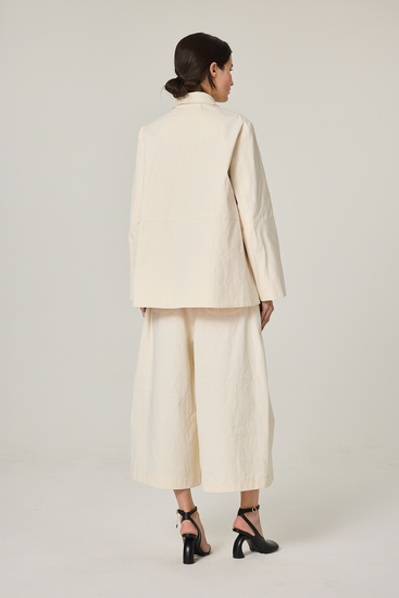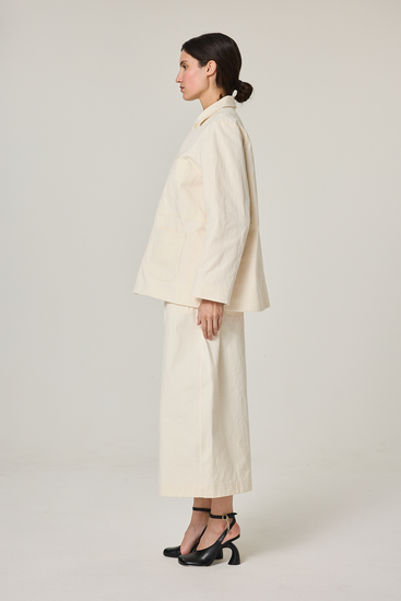 Long sleeve jacket featuring a corozo button front closure, patch pockets and a soft trapeze silhouette. Cut in a structured twill gabardine from Japan. Lined in paper cotton poplin.