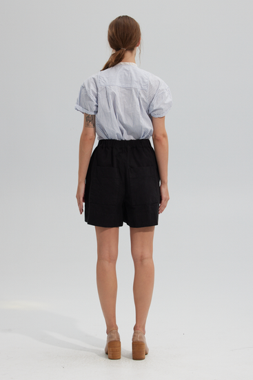 Elasticized wide leg sculptural shorts, featuring side slit pockets, back rounded patch pockets and inside ribbon ties. Cut in a custom dyed high density heavy weight Japanese cotton cloth.