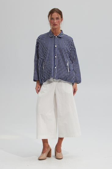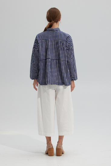 Long sleeve jacket featuring a double tiered back, side pockets and hand beaded shank buttons. Fully lined in light weight paper cotton. Cut in a light weight Japanese printed cotton plaid.