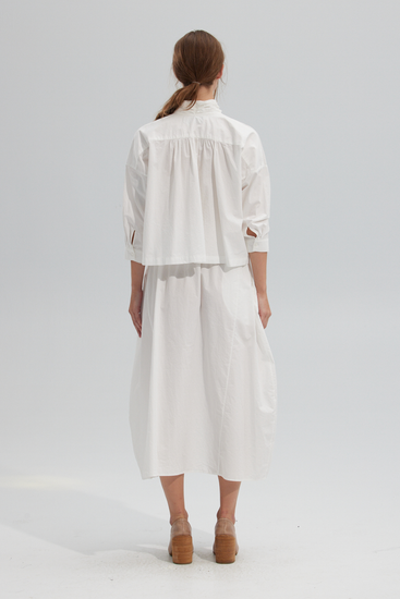 Button down slightly cropped length blouse, featuring a hand pleated raw edge tie around the neckline and 3/4 length sleeves. Cut in our custom dyed high density light weight paper cotton.