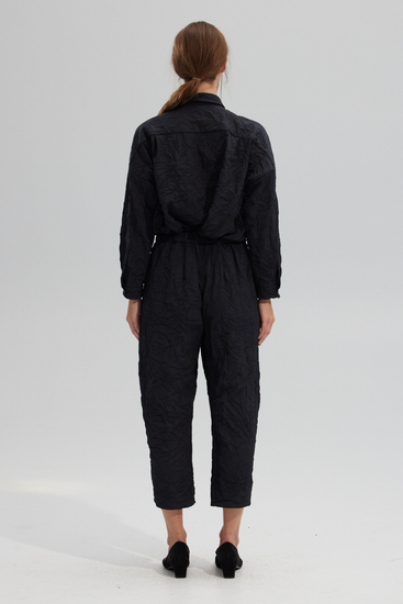 Elasticized cropped sculptural pant, featuring a slim leg and side slit pockets. Cut in a soft Japanese crinkle technical fabric.
