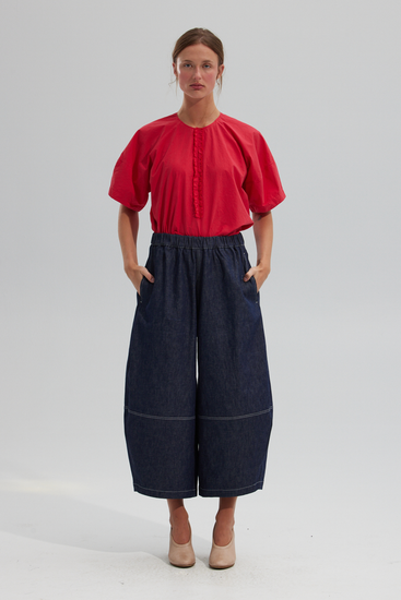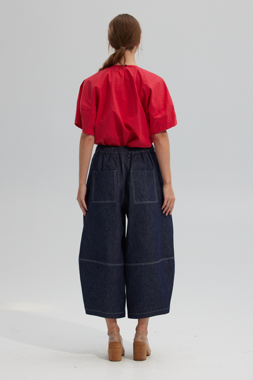 Elasticized wide leg sculptural pant, featuring seamed details throughout, contrast stitching, side slit pockets and back patch pockets. Cut in a rigid Japanese indigo denim.